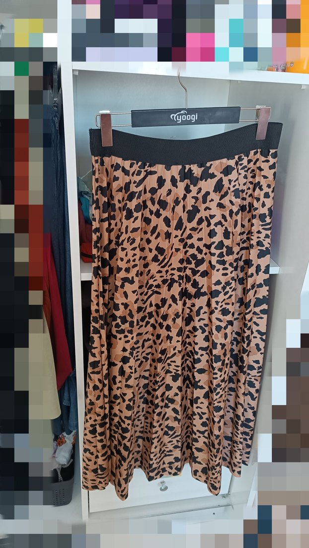 Kahverengi leopar desenli uzun piliseli etek, bol kesim ve yumuşak sentetik kumaştan. Günlük rahat ve sıcak bir sokak stili için uygundur. marka temsili sadece 1 defa kullandım yeniden farksız