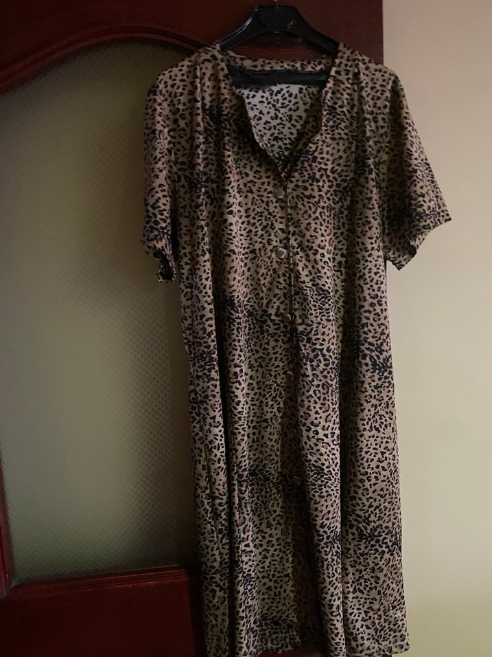 Kahverengi, leopar desenli uzun elbise, salaş kesim ve drapeli tasarıma sahiptir. Kısa kollu ve V yakalıdır, günlük sokak stili için uygundur.