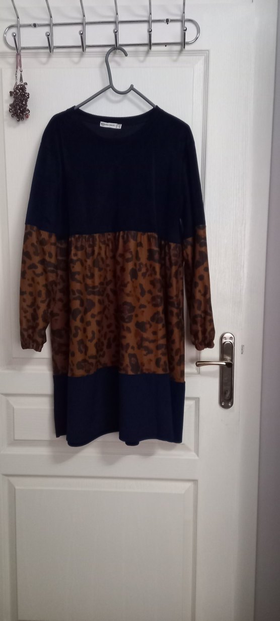 Uzun, bol kesim ve yuvarlak yaka olan bu tunik, koyu renkler ve kahverengi leopar desenleri ile yumuşak kürk detaylarına sahip. Bohem ve retro esintili rahat sokak stili sunar.