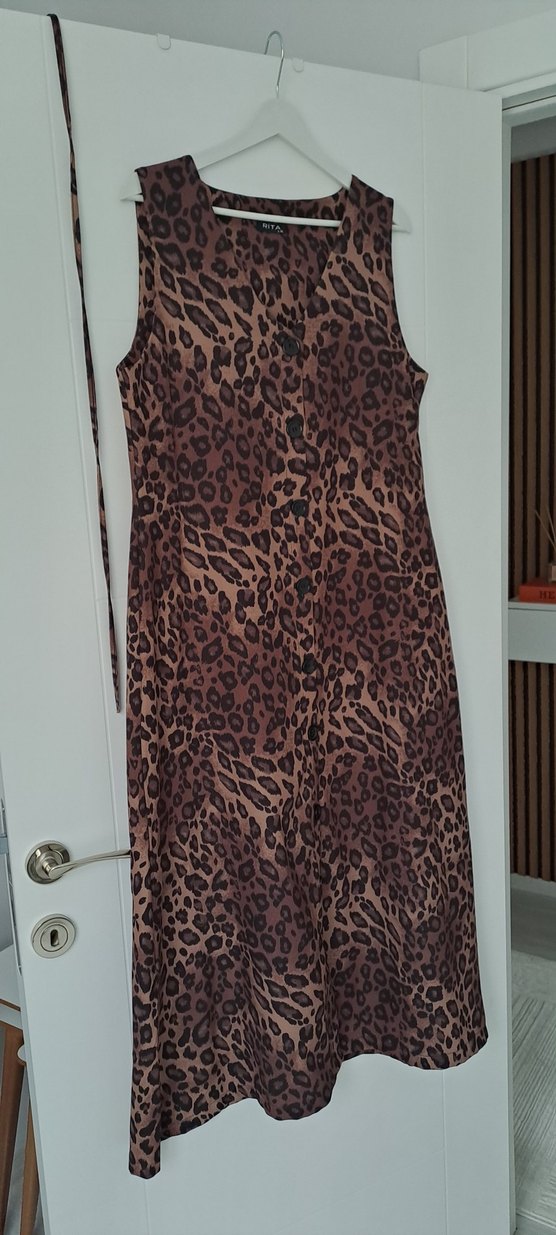 Kahverengi leopar desenli, kolsuz, uzun ve bol kesim elbise, drapeli tasarımıyla bohem tarzda günlük kullanım için uygundur.