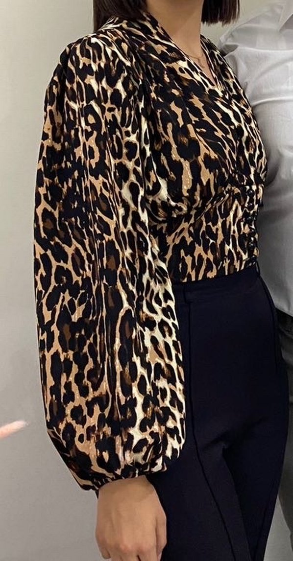 Kahverengi Leopar Desenli V Yakalı Bluz