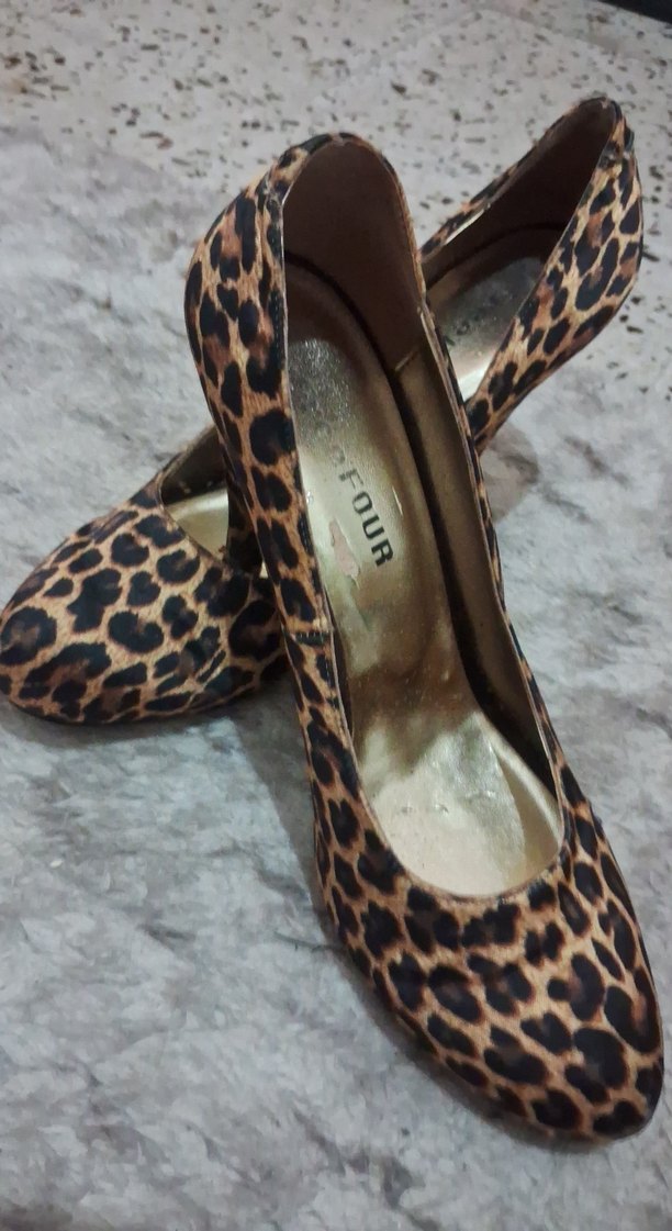 Kahverengi leopar desenli, kürklü detaylara sahip yüksek topuklu stiletto. Kauçuk malzemeden, cesur ve çağdaş tarzda, günlük kullanıma uygun.