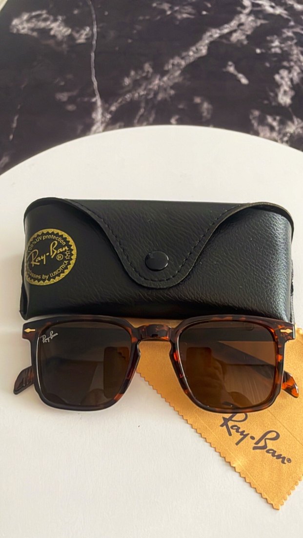 Kahverengi klasik Ray-Ban güneş gözlüğü, tokalı tasarıma sahip, koruyucu kılıf ve temizleme bezi ile birlikte. ️