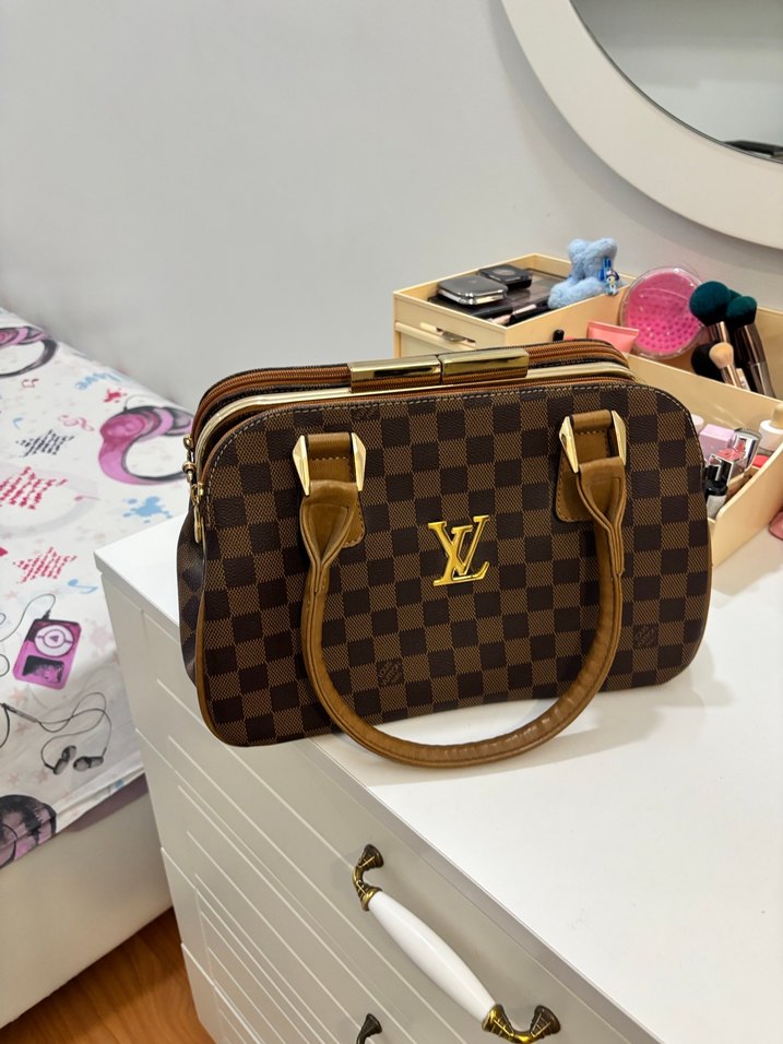 Kahverengi deri, kareli desene ve tokalı detaylara sahip parlak yüzeyli kadın çantası, modern klasik tarzda günlük kullanıma uygundur. Kullanılmadı