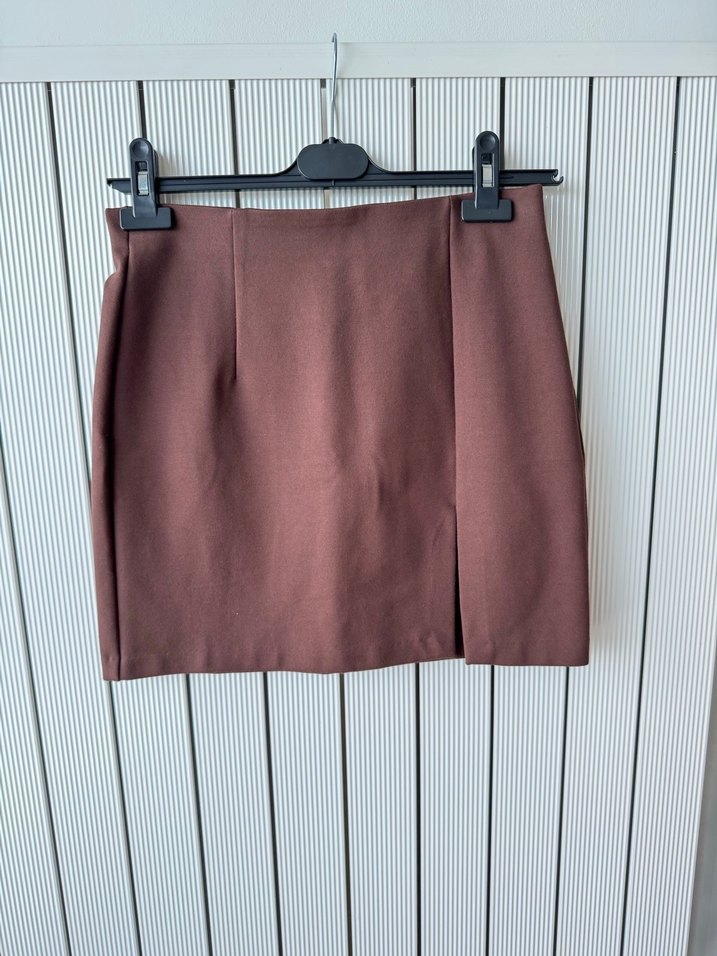 Kahverengi mini etek, vücuda oturan kesimi ve düz deseniyle günlük sokak stiline uygun, yumuşak sentetik kumaştan yapılmıştır.