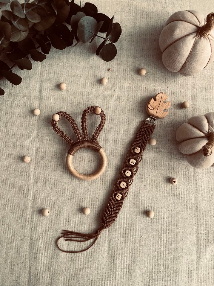 Kahverengi Makrome Diş Kaşıyıcı ve Emzik Askısı