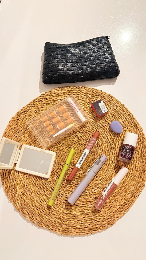 Kahverengi tonlarında çeşitli makyaj ürünleri ve siyah dokulu makyaj çantası içeren set. ✨ Hepsi bir set olarak satılmaktadır çanta ve makyaj aynısı hediyemdir Beaulis smoot: 382 numara mat ruj Beaulis keepıt: 164 kalem ruj Bealuis eyeliner: 399 Bealuis rimel: 175 numara