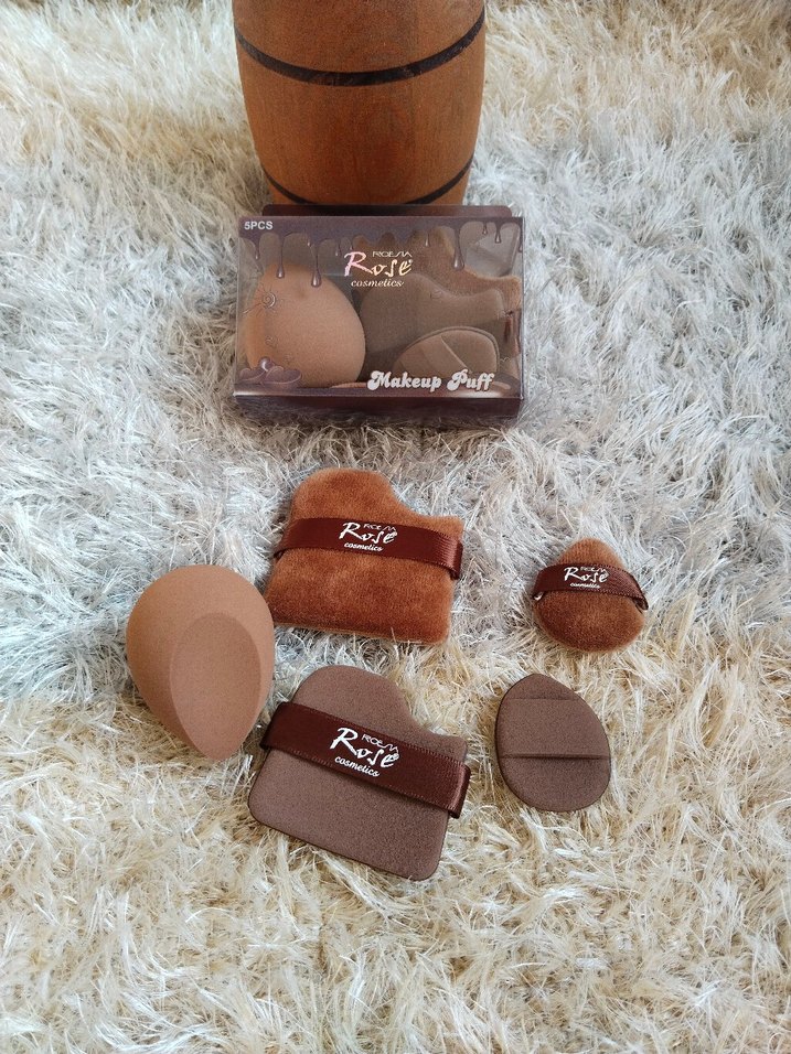 KAHVERENGİ tonlarında farklı şekillerde makyaj süngerleri içeren set.