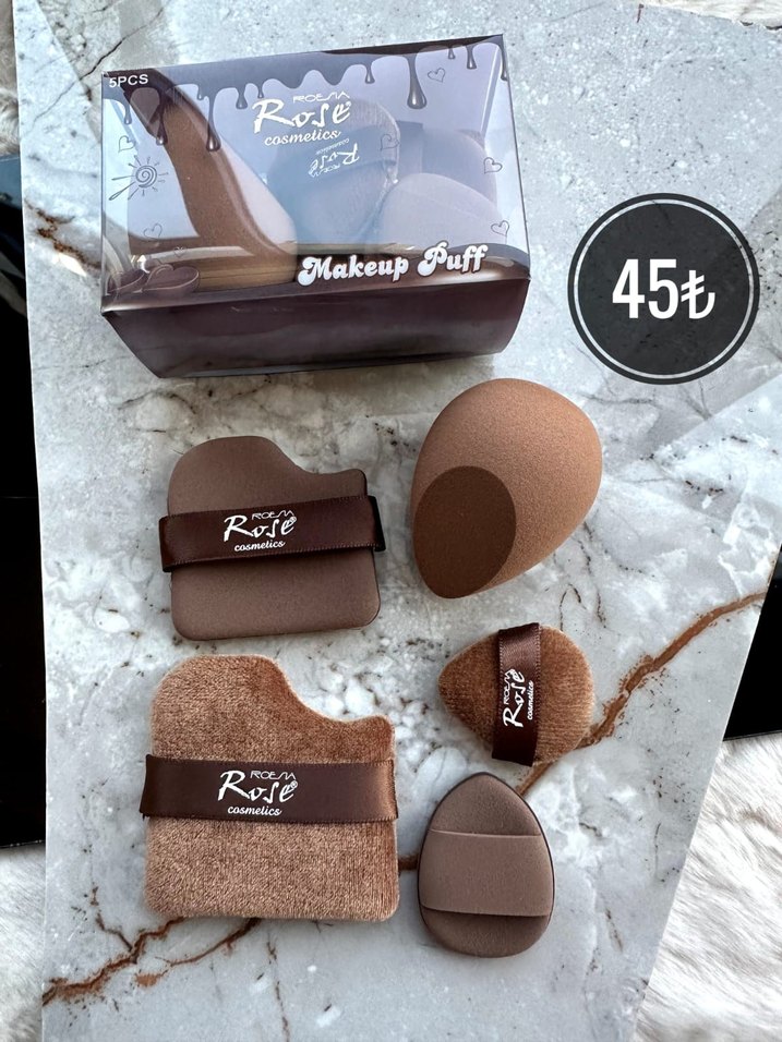 Rose Cosmetic markasına ait çeşitli şekil ve yumuşak dokulu kahverengi makyaj süngeri ve puff seti.
