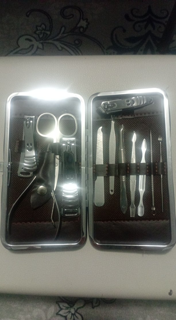 Kahverengi kompakt kutuda çeşitli tırnak makasları, cımbızlar ve bakım aletleri bulunan manikür ve pedikür seti. ✂️