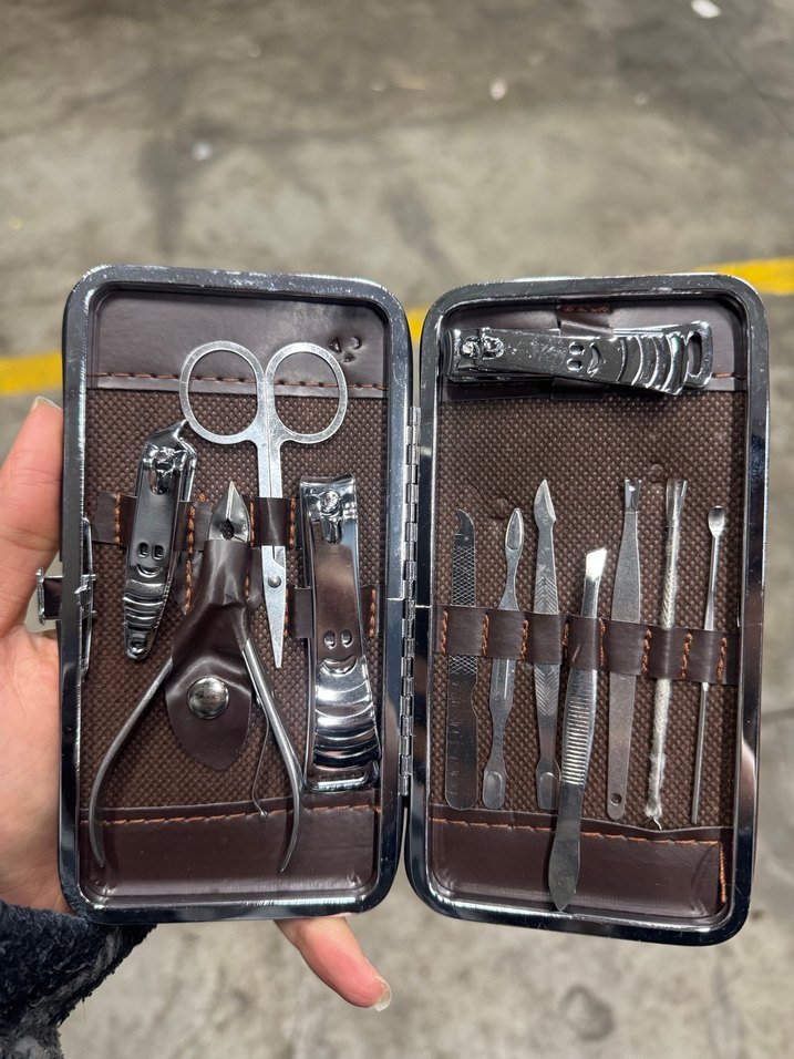 Kahverengi manikür ve pedikür seti, tırnak makası, makas, törpü ve diğer bakım araçlarını kompakt bir kutuda sunar. ✂️
