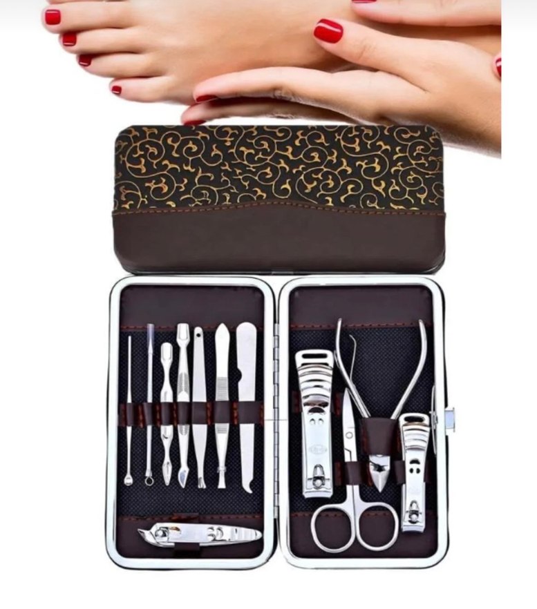 Kahverengi şık kutusunda çok sayıda manikür ve pedikür aleti bulunan set, tırnak bakımı için uygundur.