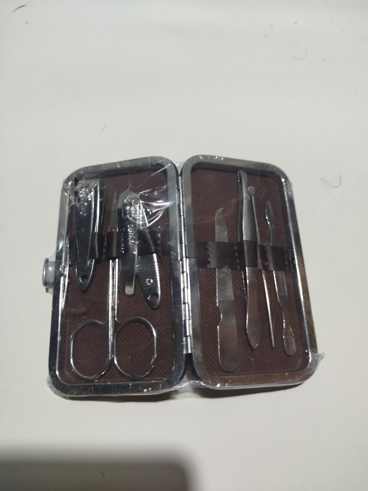 Kahverengi manikür ve pedikür seti, makas, tırnak makası, törpü, cımbız ve diğer temel tırnak bakım aletlerini içerir.