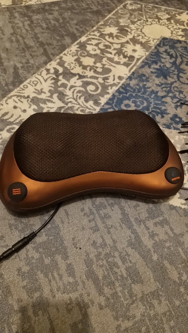 Kavisli tasarıma ve file kaplamaya sahip koyu kahverengi boyun masaj aleti üzerinde iki kontrol düğmesi bulunur.