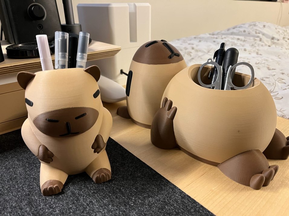 Kahverengi masaüstü aksesuar seti, kalem ve küçük eşyalar için sevimli hayvan figürlü düzenleyiciler içerir. 3d baskı ürünüdür.