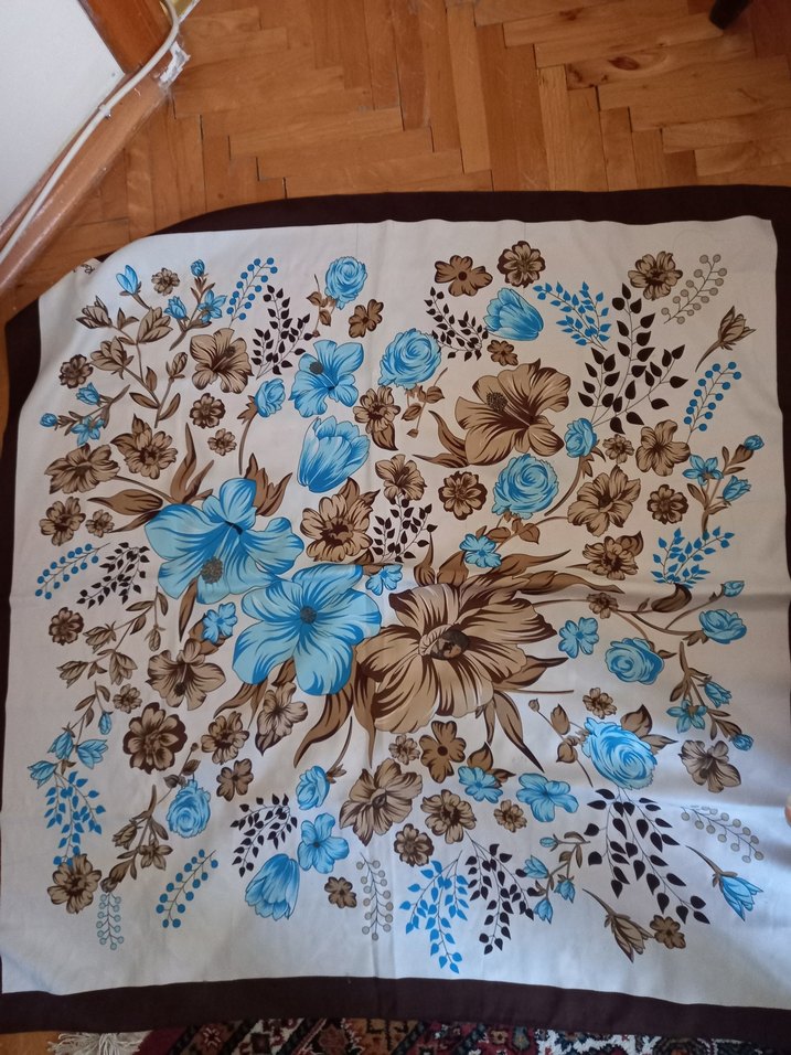 Kadınlar için koyu kahverengi zemin üzerine canlı mavi ve kahverengi çiçek desenleri bulunan, yumuşak sentetik kumaştan yapılmış, bohem ve retro tarzlara uygun drapeli fular. 90x90 cm..iade yok
