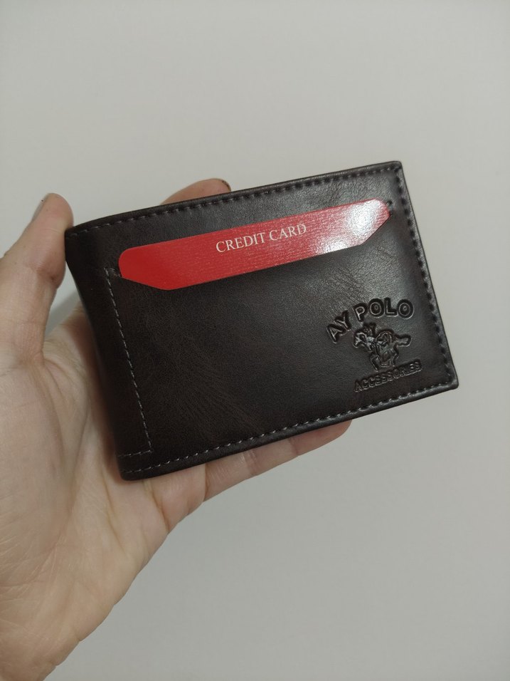 Kahverengi biker tarzı erkek cüzdanı, baskılı logo ve kredi kartı bölmesi içerir. Mekanizmalıdır. Koyu tonlarıyla iş tarzına uygundur.