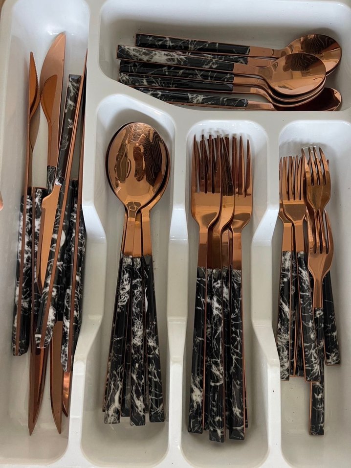 Bu çatal kaşık bıçak setinde kahverengi mermer desenli saplar ve gül altın renginde metal parçalar bulunur.