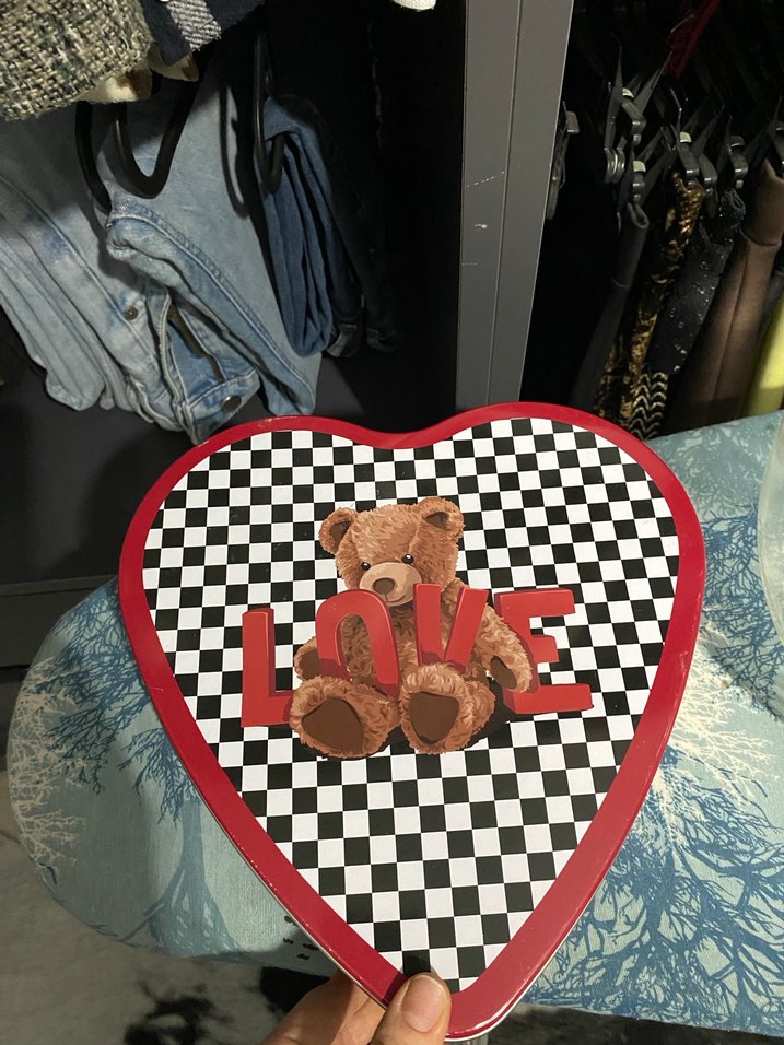 Kahverengi ayıcık ve 'LOVE' yazısı bulunan siyah beyaz kareli desenli kalp şeklinde kutu. Kırmızı çerçeveli.