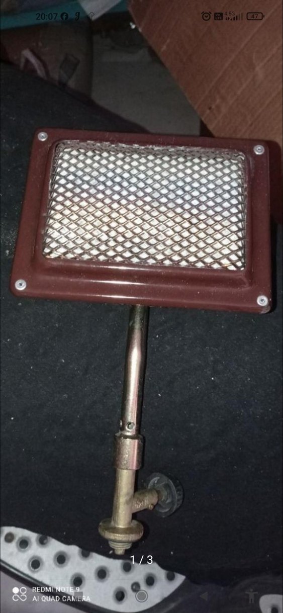 kamp ocağı piknik tüpü ne uyumlu Önünde koruyucu ızgara bulunan kahverengi metal ısıtıcı, ayarlanabilir ayağa sahiptir. Hedefe yönelik ısıtma için uygundur.