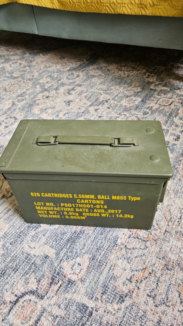 Yan tarafında baskılı yazılar bulunan, kilitli tutma saplı koyu haki metal taşıma kutusu. mühimmat sandigi,mermi kutusu,takim cantasi,agir saglam,demirdir.Elimizde 5 taneden fazla var.toplu alimda indirim olur. olculeri 28 boy 14.5 en 18.5 yukseklik