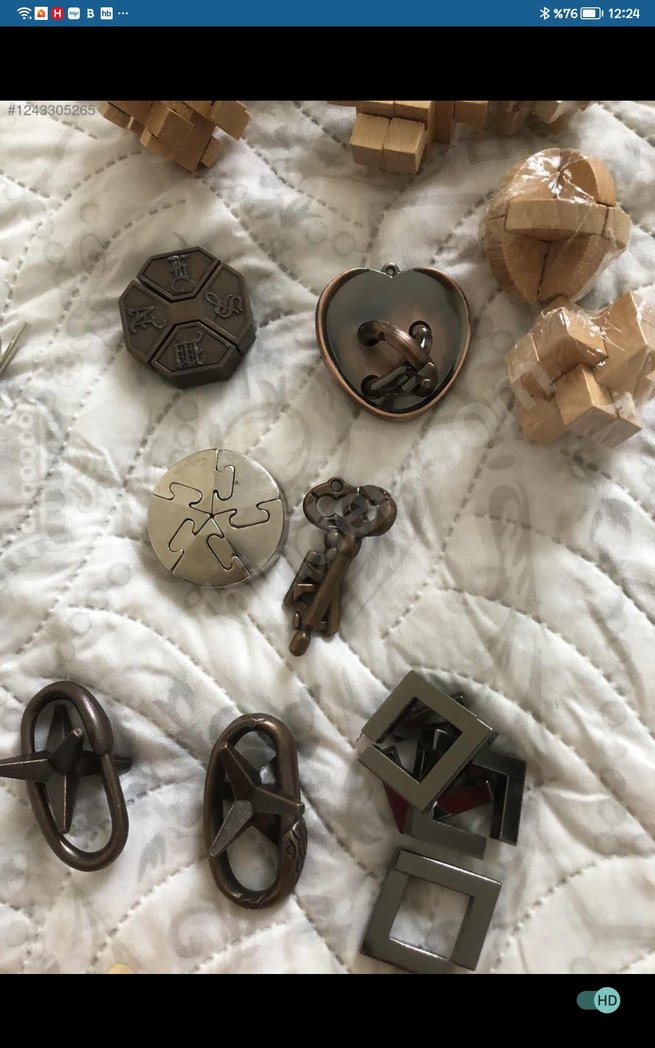 Anahtarlı, kalpli ve geometrik şekilli koyu kahverengi metal zeka bulmacaları seti.