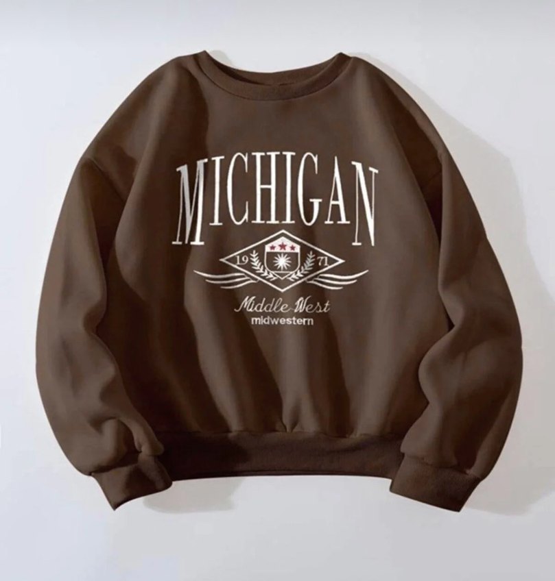 S/M beden kahverengi, uzun kollu, bol kesim sweatshirt. Önünde Michigan baskısı bulunur, yumuşak ve sıcak kumaştan üretilmiştir.