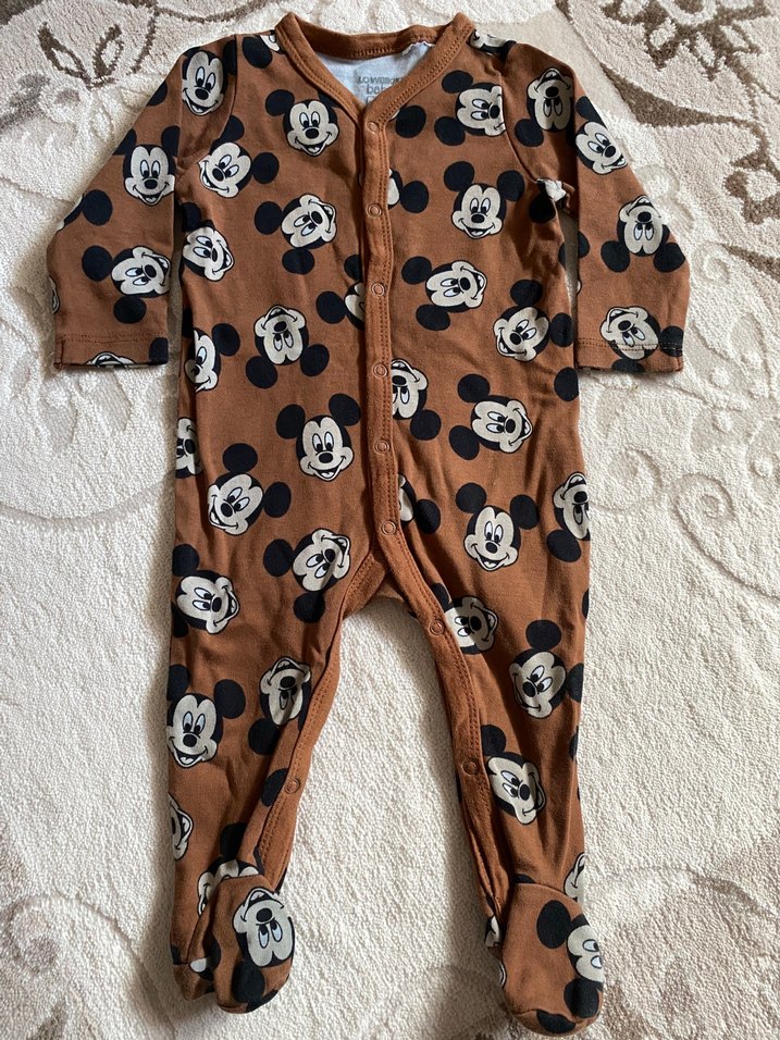 Uzun kollu, yuvarlak yakalı kahverengi bebek tulumu, düğmeli ve baskılı Mickey Mouse desenli, yumuşak ve sıcak kumaştan, diğer tulumlarda aynı şekilde yumuşacık ve çok az kullanıldılar