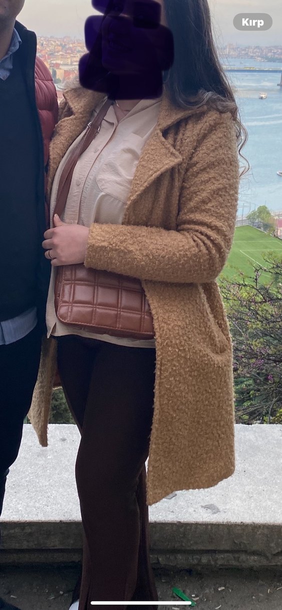Kahverengi, kemerli, notched lapel yakalı, uzun kollu, hafif dokulu kumaştan midi boy kaban. Günlük sokak stiline uygun, şık ve rahat.
