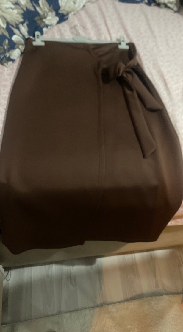 Kahverengi midi boy, drapeli ve yan fiyonk detaylı, satenimsi dokuda, minimal ve normcore tarzda kadın eteği. Ofis kullanımı için uygundur.