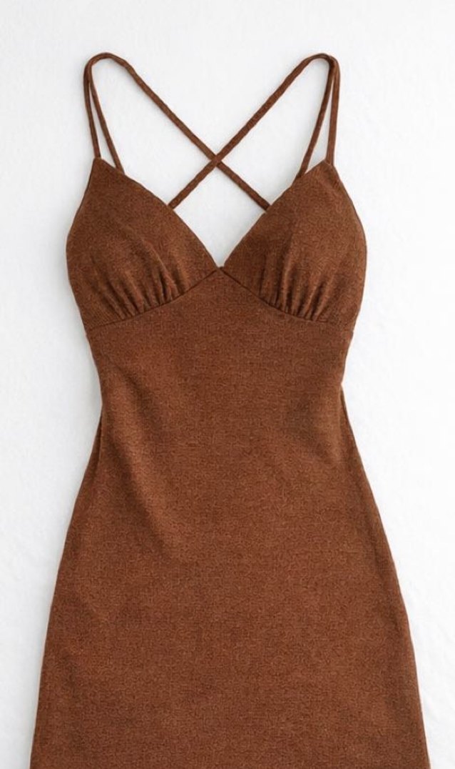 V yaka ve ince askılı, kahverengi triko midi elbise. Minimalist ve cesur tarz için uygun.