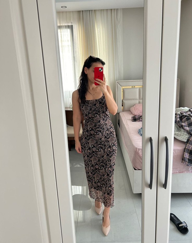 kahverengi yılan derisi desenli, askısız ve vücuda oturan midi elbise. Tül kumaştan, astarlı romantik akşamlar için ideal. Defosuz