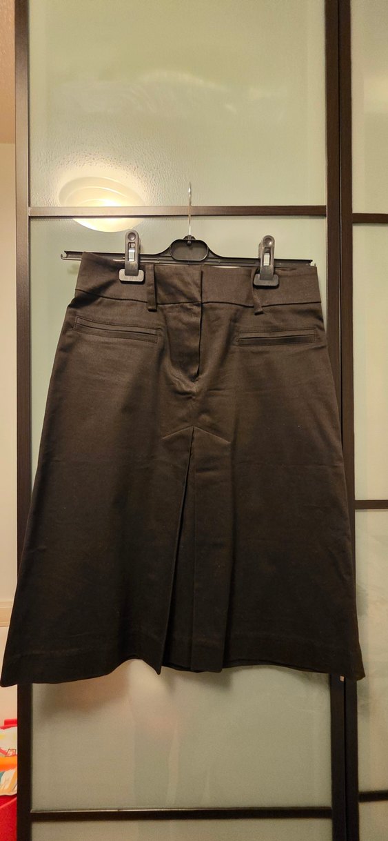 Kahverengi, midi boy, bel kemerli eteği. İpek gibi kumaştan, düzenli kesim, ofis ve iş ortamları için uygun, gotik tarzda.