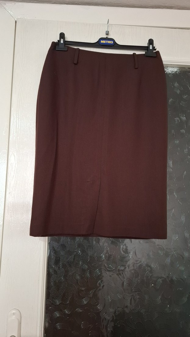 Koyu kahverengi midi etek, düz ve drapeli tasarımı ile ofis ve iş ortamına uygundur. Düzgün sentetik kumaştan, normal kesimdir. Fotoğrafta görüldüğü gibi astarında leke var dışarıdan görülmüyor, Bel 42 boy 65,5 cm
