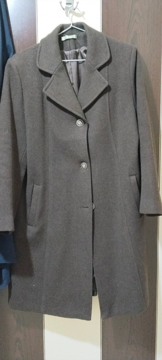 kahverengi midi uzunlukta, düğmeli ve klasik kesime sahip kaşe kadın kabanı. Ofis için uygun, uzun kollu ve desensizdir.