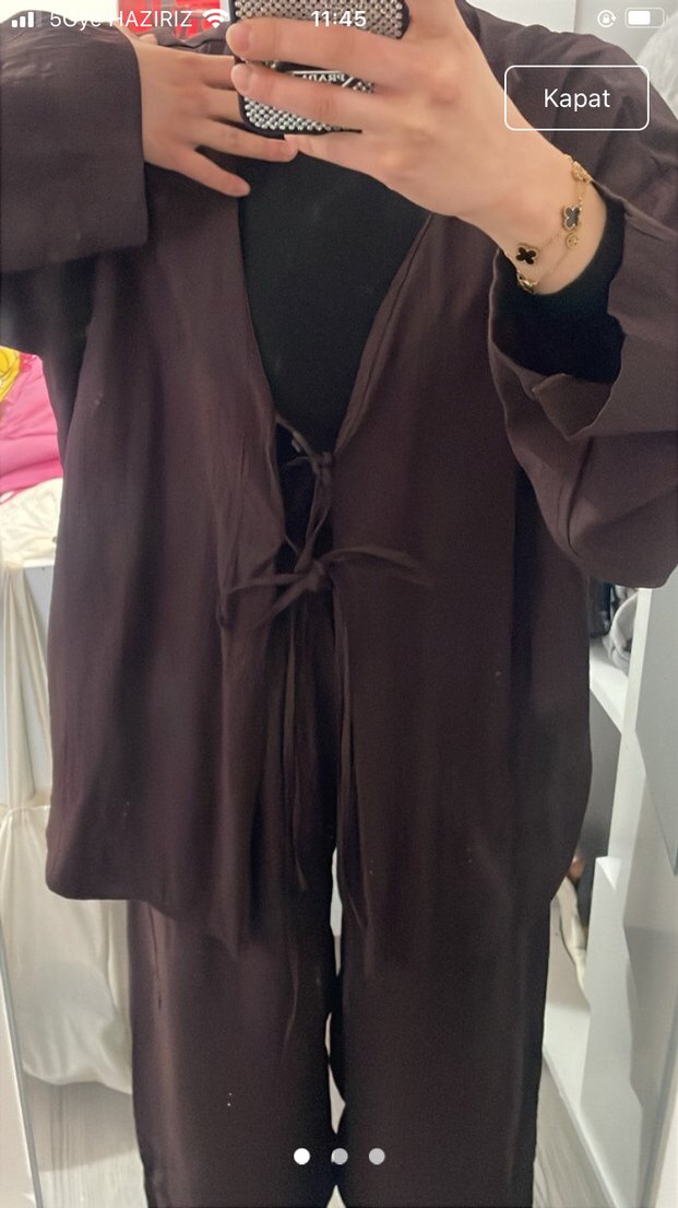 Kadınlar için bol kesim, midi boy, uzun kollu ve kahverengi tek renk minimalist ve normcore tarzda rahat bir roba.