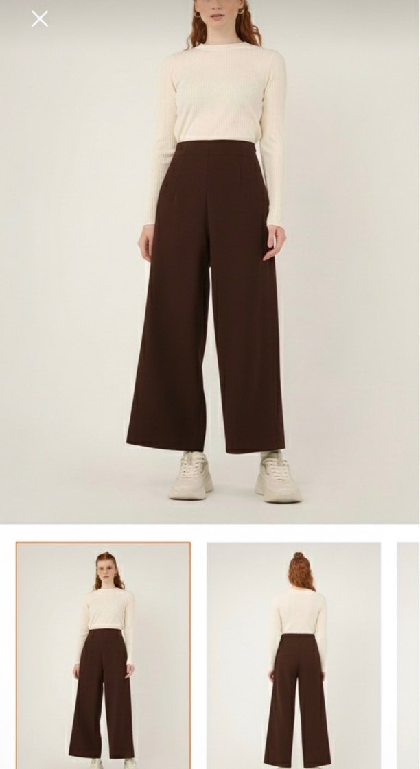Kahverengi midi uzunlukta, düz kesim ve desensiz kadın kumaş pantolon. Sentetik kumaştan üretilmiş, minimalist ve normcore tarzıyla günlük kullanıma uygun şık bir model. HE-QA MİDİ PALAZZO PANTOLON ETKETLİ İKİ PANTOLON DA HİÇ GİYİLMEDİ. 100cm
