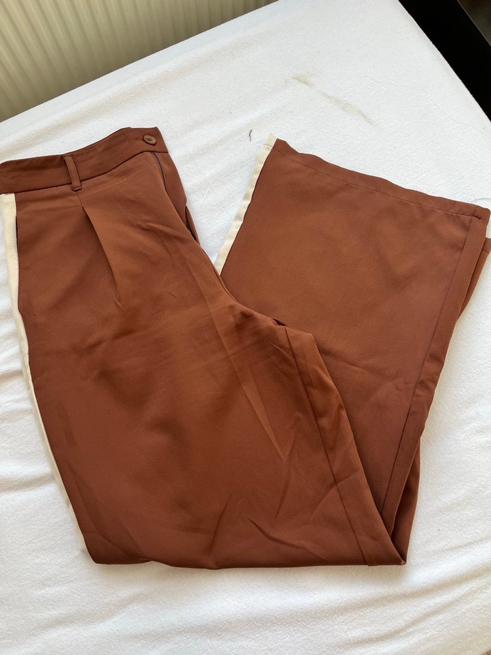 Kahverengi midi uzunlukta, regular fit kadın kumaş pantolon, ipeksi dokulu, ofis ortamı için minimal ve streetwear tarzda.