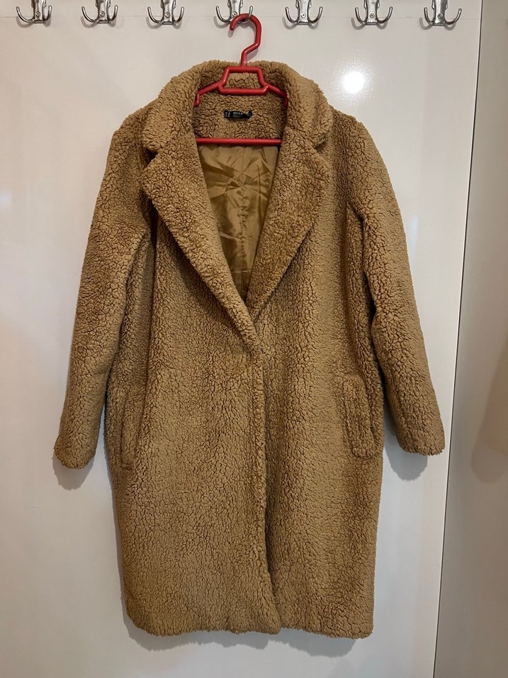 Kahverengi midi kaban, kürk detaylı ve yakalıdır. Rahat kesimi ve uzun kollarıyla günlük rahat sokak stiline uygundur.