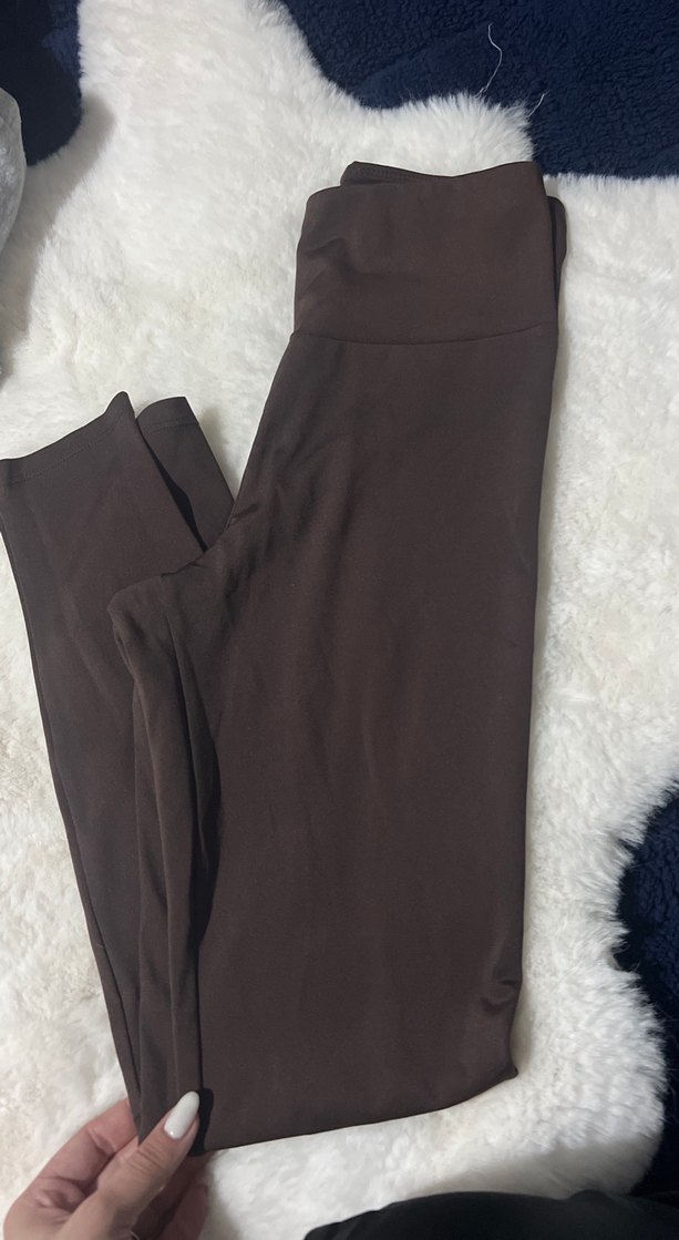 Koyu kahverengi, vücuda oturan, yumuşak ve sıcak dokulu midi uzunluğunda düz tayt. Günlük rahatlık ve sade, zahmetsiz şıklık sunar.