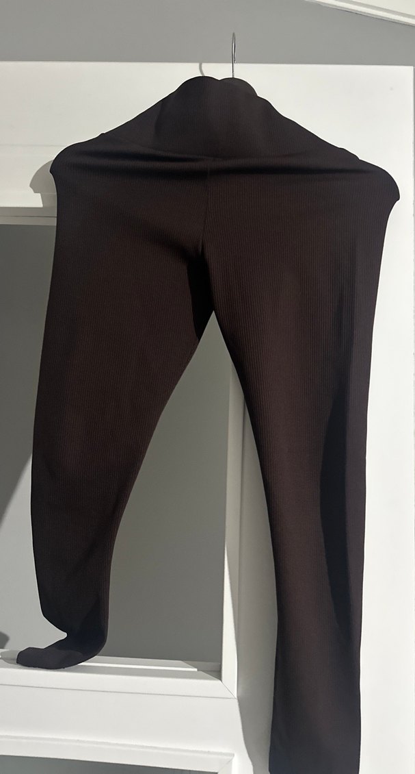 Kahverengi midi uzunlukta, sentetik kumaştan yapılmış, dar kesim kadın tayt. Günlük kullanıma uygun, rahat ve şık sokak stili için ideal.
