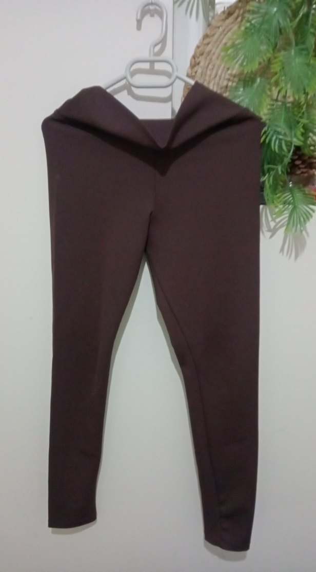 Yumuşak sentetik kumaştan kahverengi, vücuda oturan midi tayt, günlük sokak stili için minimal ve trend görünümlü.