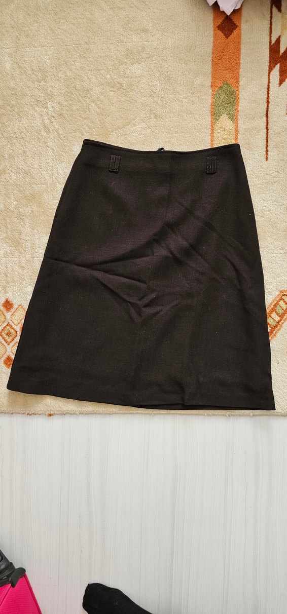 Kahverengi, sentetik kumaştan yapılmış, midi boy, düz ve kalem kesim etek. Ofis kullanımı için uygun, rahat bir görünüme sahip.