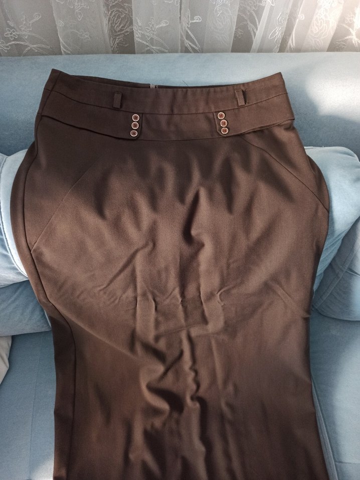 Kahverengi, midi uzunlukta, kemerli ve kalem kesim etek. Düz ve şık tasarımıyla ofis ve sokak stiline uygundur.