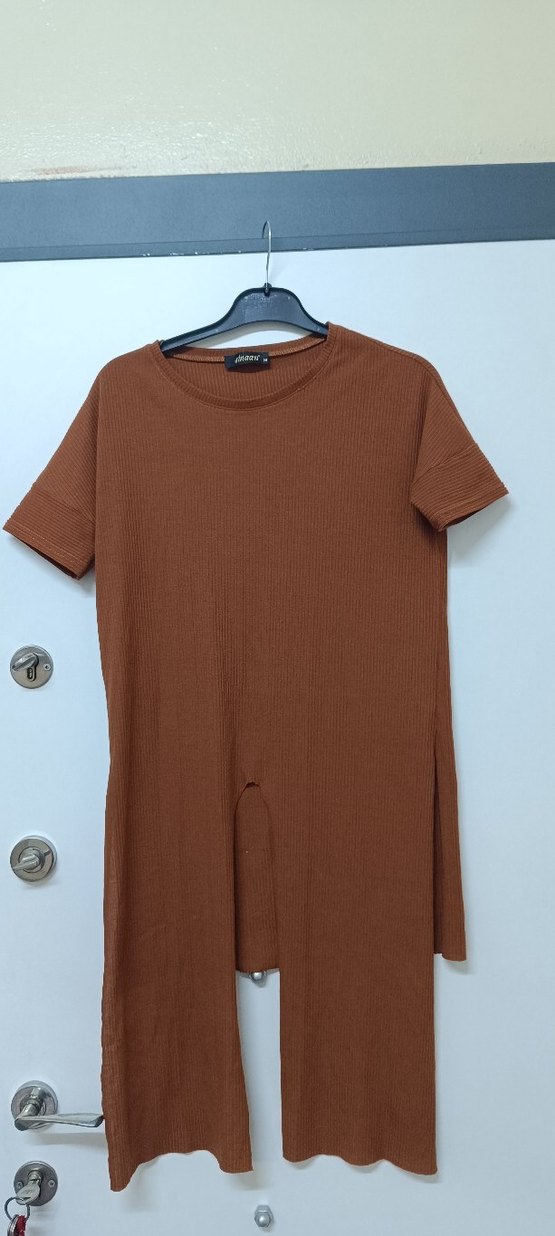 Kahverengi midi uzunluğunda, yuvarlak yakalı, kısa kollu ve yırtmaç detaylı bol kesim kadın tişörtü. Yumuşak sentetik kumaştan üretilmiştir, günlük sokak stiline uygundur.