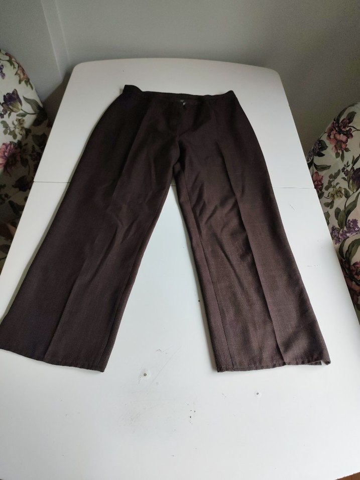 Kahverengi keten kumaştan, normal boy midi kesim, rahat ve sade normcore tarzda kadın pantolon. Ofis için uygun.