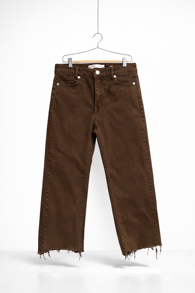 Kahverengi denim kot pantolon, normal kesim ve midi boyda, kesik paçalarla minimal ve zahmetsiz şıklık sunar. Havoş butik