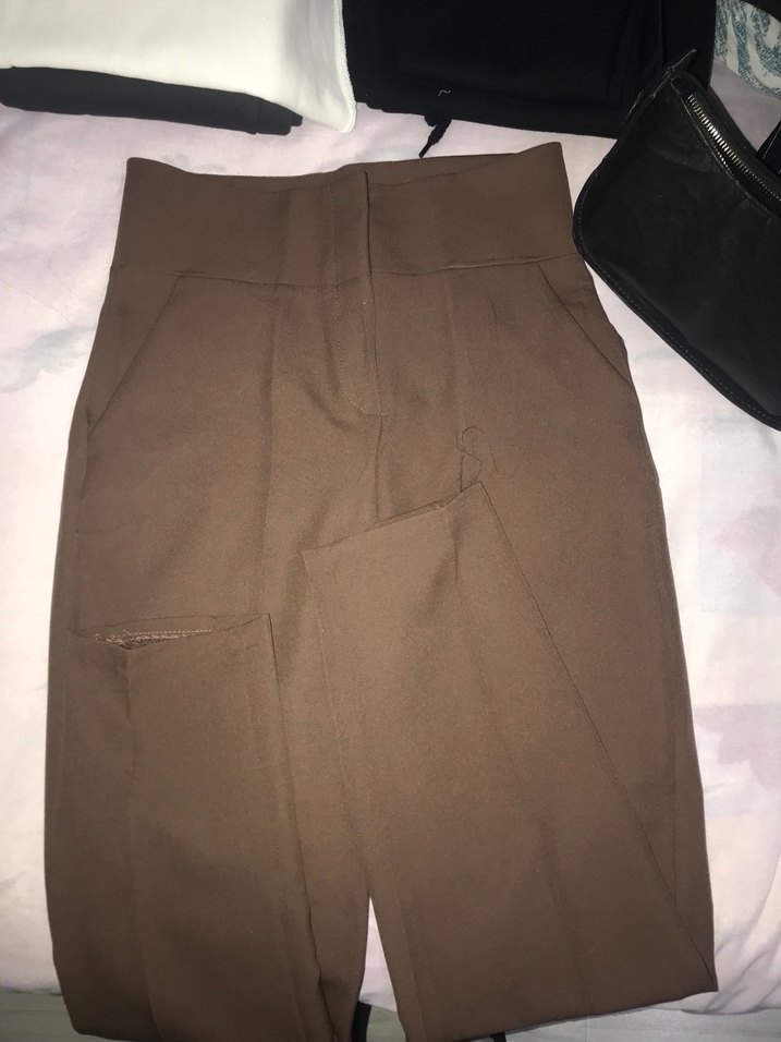 Kahverengi, midi boy, kemerli ve regular fit kumaş pantolon. Düz ve ofis kullanımına uygun, sentetik dokulu kumaştan üretilmiştir.