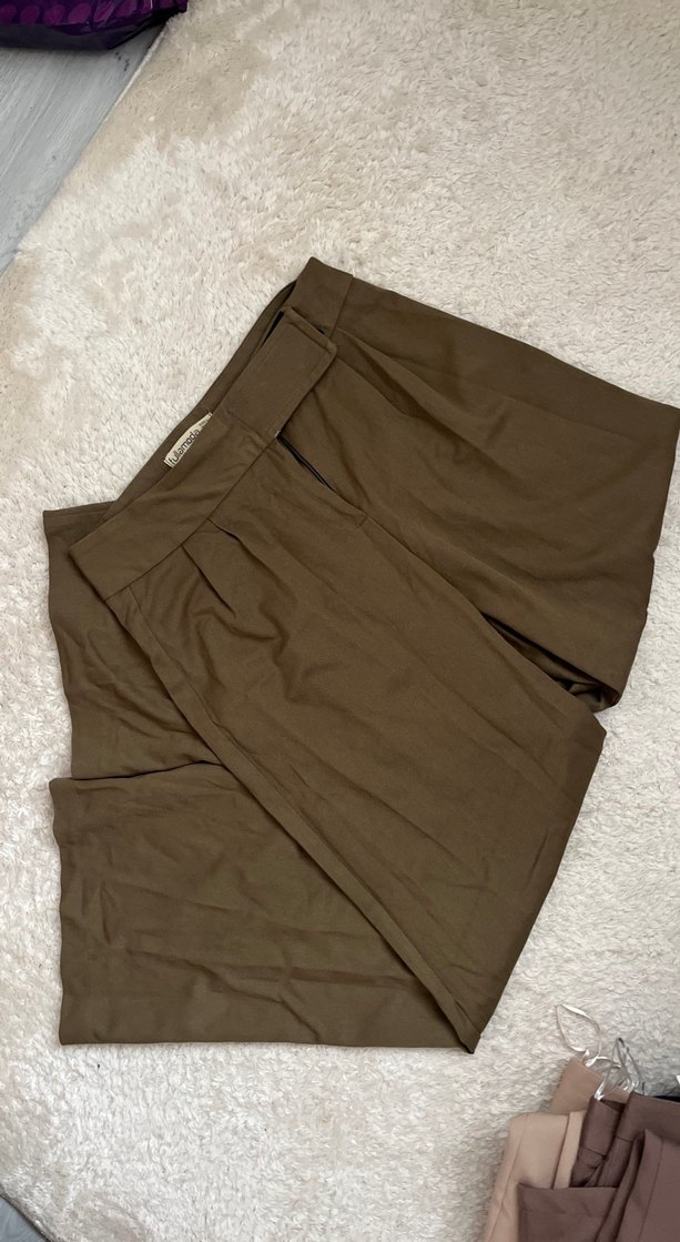 Kahverengi midi uzunlukta, düz kesim kumaş pantolon. Yumuşak sentetik malzemeden üretilmiş, günlük kullanıma uygun sade ve rahat tasarım. Palazzo