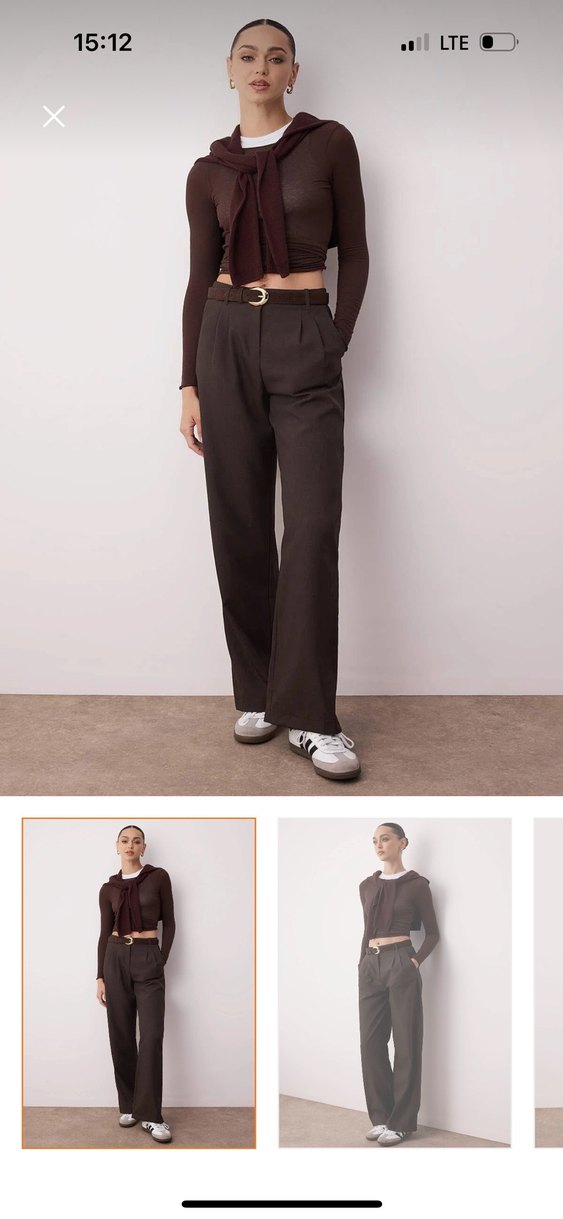 Kahverengi midi uzunlukta, düz desenli, rahat sentetik kumaştan yapılmış, ofis için uygun trend ve rahat kadın pantolonu.